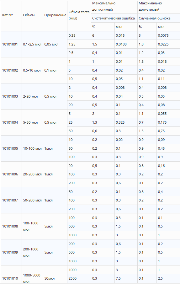 3. Пипетки охватывают диапазон объемов от 0,5 мкл до 1 мл.