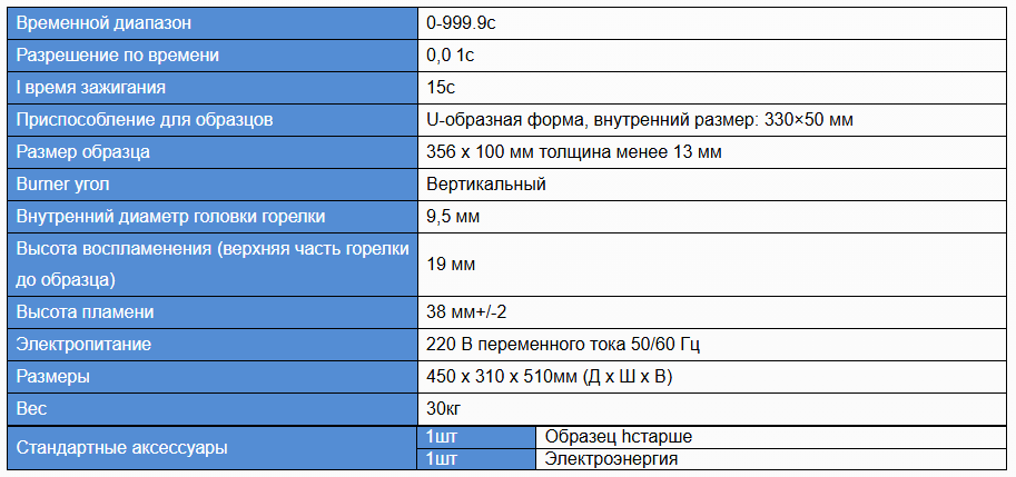 - Горизонтальная камера для испытания на воспламеняемость: автоматическое сжигание электрической искры.