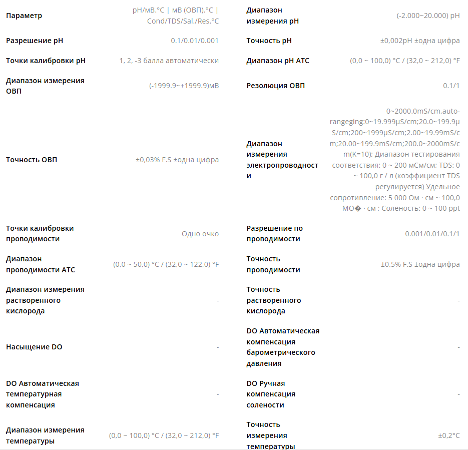 - Режим кондуктора: поддержка постоянной калибровки щупа, калибровка стандартного раствора проводимости