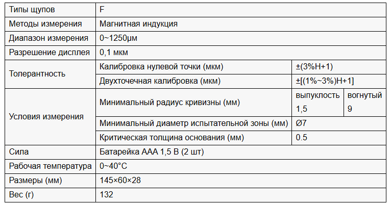 ● Магнитная индукция (F), измеряющая толщину немагнитных материалов (например, краски, пластика, фарфоровой эмали, меди, цинка, алюминия, хрома и т. д.) на магнитных материалах (например, железе, никеле и т. д.). Калибровка нулевой точки и калибровка по двум точкам для исправления системной ошибки пробника