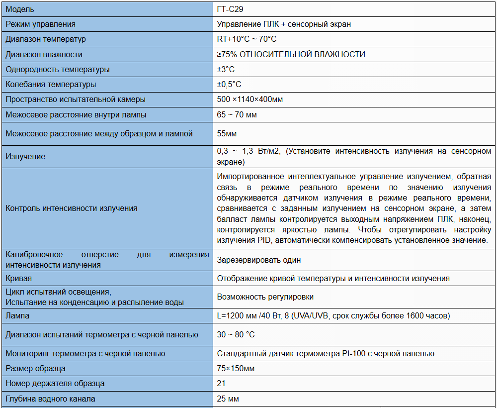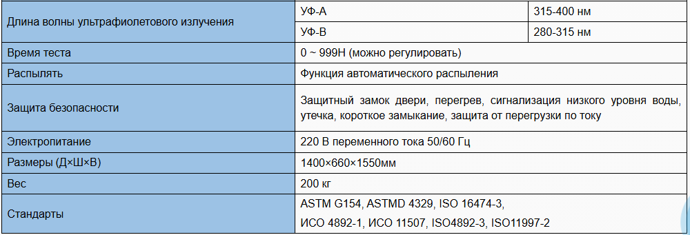 4. Лампа: специальный ультрафиолет, UVA-340 или UVB-313 (опция), 8 ламп, по 4 с каждой стороны, всего 2 стороны, 40 Вт/1.