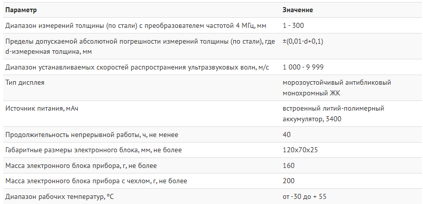 Толщиномер обладает длительным временем работы (не менее 40 ч без подзарядки), благодаря встроенному литий-полимерному аккумулятору.
